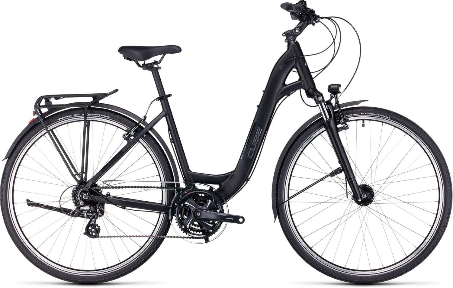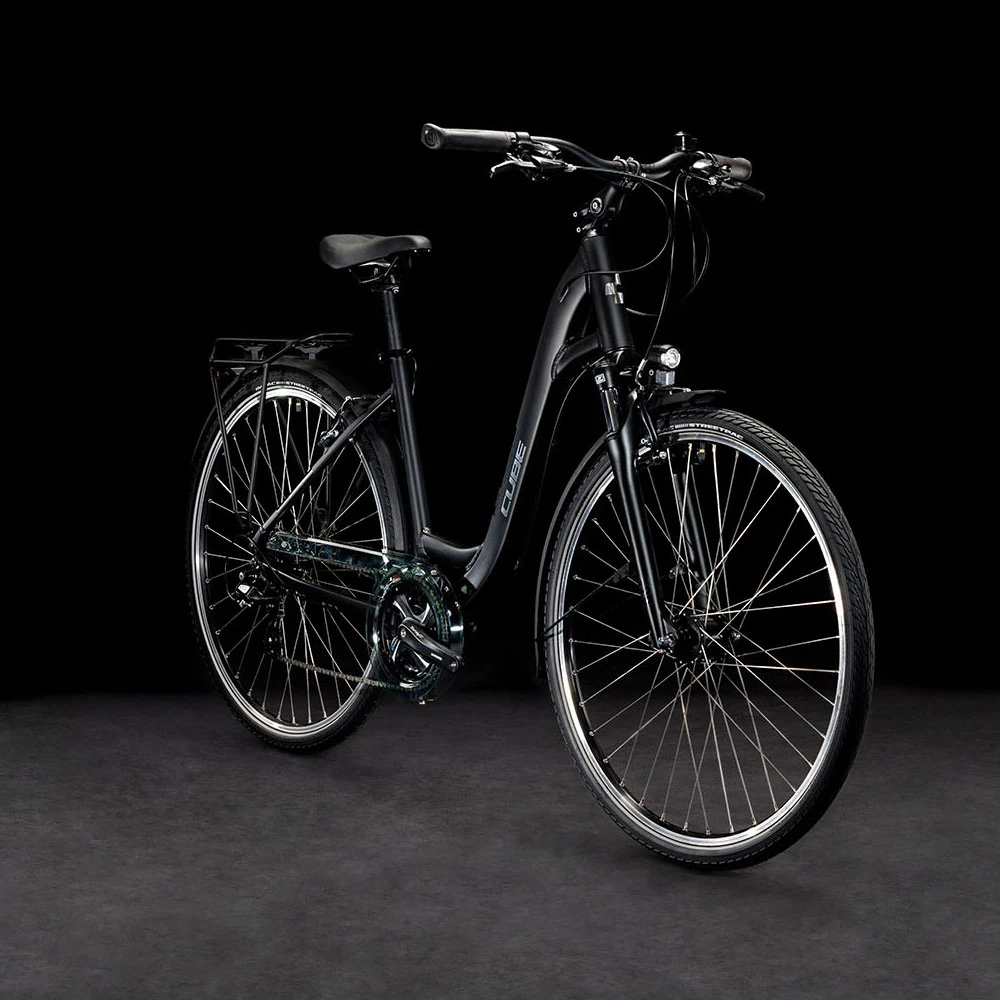 CUBE hat außerdem jede Menge praktisches Zubehör verbaut, zum Beispiel einen ästhetisch integrierten Gepäckträger, lange Schutzbleche, eine dynamobetriebene Lichtanlage und einen Seitenständer. Damit ist man für alle Eventualitäten optimal gerüstet. Und das Gängewechseln geht dank der 3×8-Schaltung von Shimano ebenso einfach wie das sichere Bremsen mit den leichten, aber kraftvoll zupackenden Felgenbremsen. Selbstverständlich hat das Rad unsere strengen hauseigenen Sicherheits- und Härtetests mit Bravour bestanden.