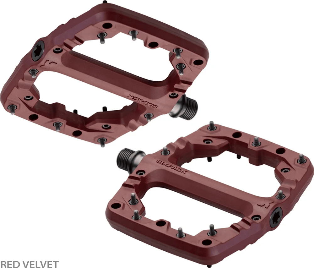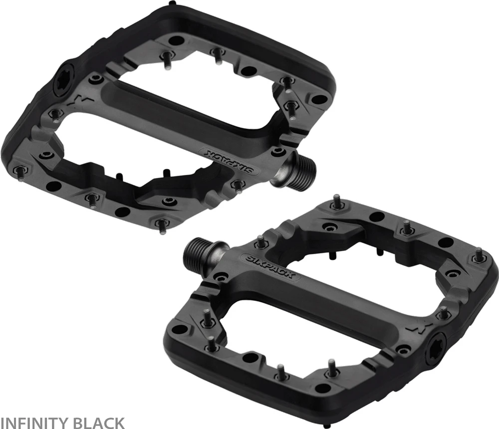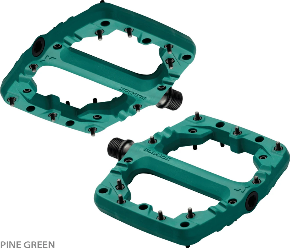 Die Gravity Pedale „Kamikaze PA“ von Sixpack Racing verfügen über eine große Standfläche mit einem vorgeformten Profil und 18 extra langen Pins aus Stahl. Der Composite Pedalkörper ist aus glasfaserverstärktem Polyamid gefertigt und hält extreme Belastungen aus.