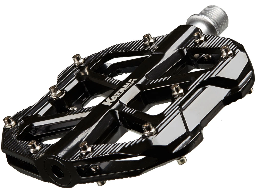 Die flachen Katana Blade Pedale bestehen aus einem robusten Aluminium-Korpus und sind mit jeweils zehn Evo-Pins für den nötigen Grip auf allen Trails versehen. Der Alu-Pedalkörper und die CNC-gefrästen Achsen sorgen in Verbindung mit hochwertigen Kugellagern für eine hohe Lebensdauer in jedem Einsatzbereich, selbst unter härtesten Bedingungen. Blade steht für flach, robust und schnell!