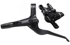 Die hydraulische 2-Kolben-Scheibenbremse von Shimano mit ergonomischen BL-MT402 3-Finger-Bremshebel und BR-MT410 Bremssattel für ausgewogene Bremsleistung, stellt den Maßstab für kostengünstige Performance-Bremssysteme da.