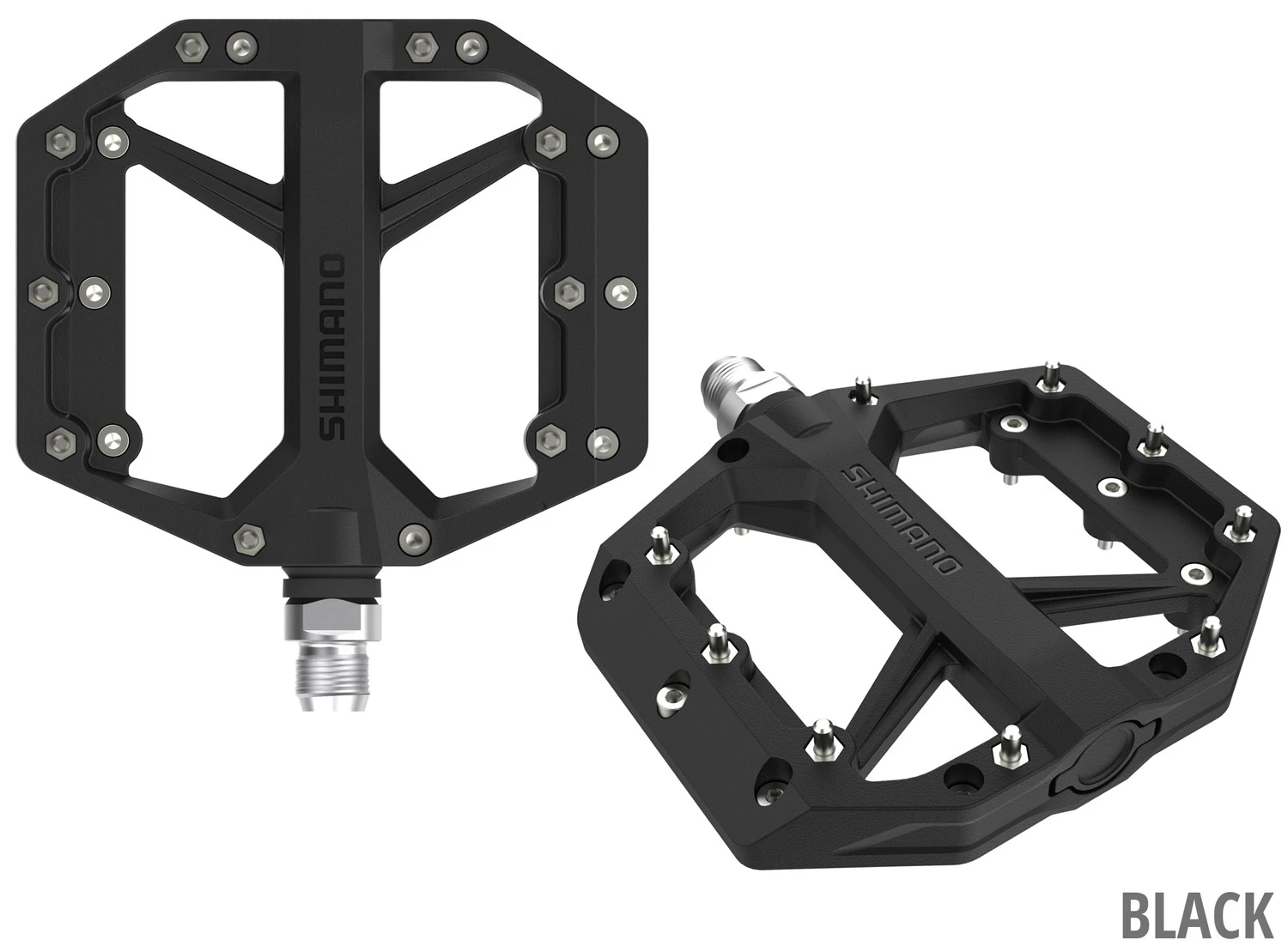 Die Shimano PD-GR400 sind griffige Flachpedale mit einer zum Trailfahren optimierten Aufstandsfläche, die sich stabil und sicher unter dem Fuß anfühlt. In Kombination mit den Schuhen der SHIMANO GR Serie bieten sie eine erstklassige Kontrolle über das Bike.