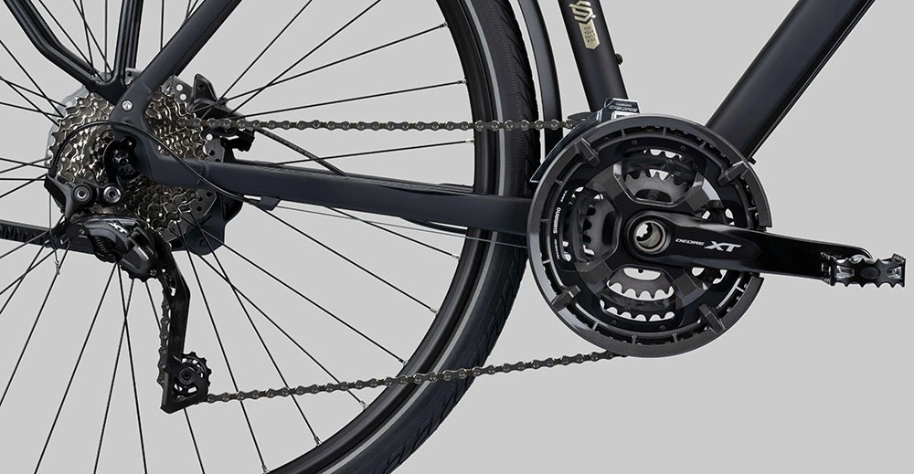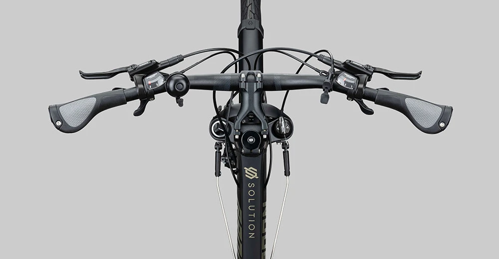 Durch die Kombination eines verwindungssteifen Aluminiumrahmens mit hochwertigen Parts entsteht ein durchdachtes Fahrrad, das dem Besitzer viel Fahrspaß bei sehr hoher Zuverlässigkeit bietet. Das Gesamtpaket beinhaltet Komfort und Service mit einer einstell- und blockierbaren Suntour NCX-D RL Federgabel, ergonomischen Griffen und Sattel von Ergon und laufruhigen Schwalbe Road Cruiser Reifen. Die gute Performance des SOLUTIONS ist durch den ausgereiften und präzißen Shimano 3×10 Antrieb gewährleistet, der mit Komponenten aus der XT und DEORE Serie für federleichte Gangwechsel und beste Übersetzungen sorgt. Fahrsicherheit und Kontrolle ergeben sich aus der hydraulischen Shimano BR-MT200 Bremse, die vom höhen- und längenverstellbaren Cockpit aus bedient werden. Dem ganzjährigen Einsatz bei jedem Wetter steht mit der elegant integrierten Schutzblech-/Gepäckträger Kombination und der superhellen, Nabendynamo-betriebenen Busch & Müller Lichtanlage nichts im Wege.